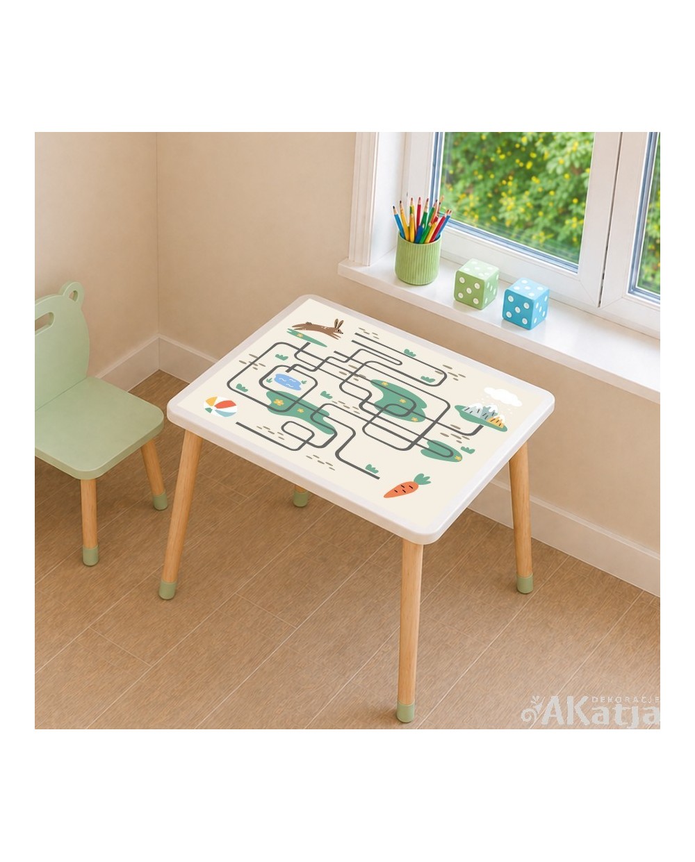 Naklejka na stolik z labiryntem to prosty sposób, aby zamienić zwykły blat w miejsce spokojnej zabawy. Leśny motyw z króliczkiem, marchewką, ścieżkami i przyrodniczymi detalami zachęca dziecko do szukania drogi, obserwowania trasy i skupienia uwagi przy stoliku.