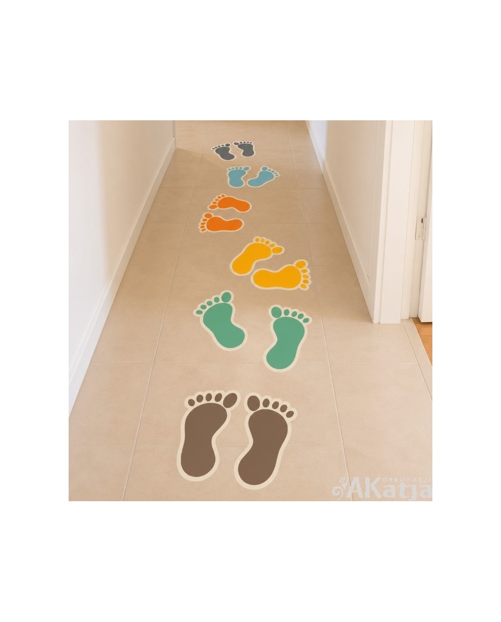 Stopki możesz przykleić w linii prostej, po łuku, z zakrętami albo w większych odstępach. Dzięki temu łatwo dopasować ścieżkę do wieku dzieci, wielkości pomieszczenia i charakteru miejsca. Przy większej ilości miejsca warto wybrać więcej kompletów, aby ścieżka była dłuższa.