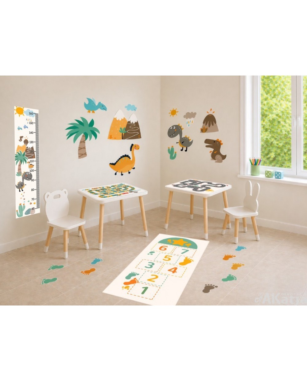 Produkty są dobrane tak, aby tworzyły spójną wizualnie i funkcjonalną przestrzeń: z ruchem na podłodze, spokojną zabawą przy stolikach, dekoracją ścienną oraz miejscem na krótką wiadomość, rysunek lub informację.