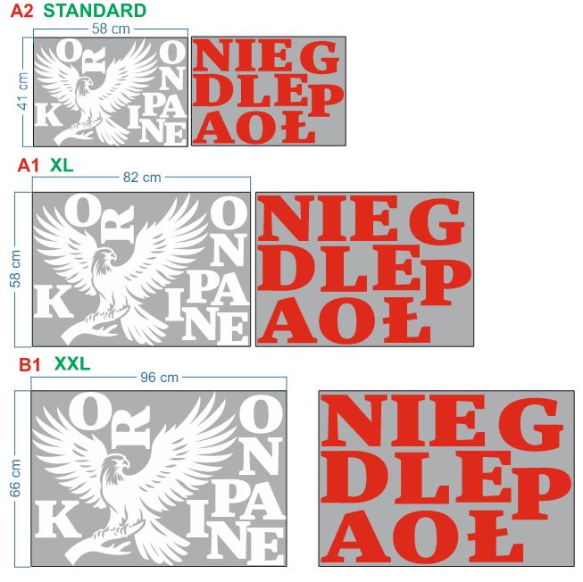 Standard około 140x70cm -litera duża: 12 cm; mała: 8,5cm