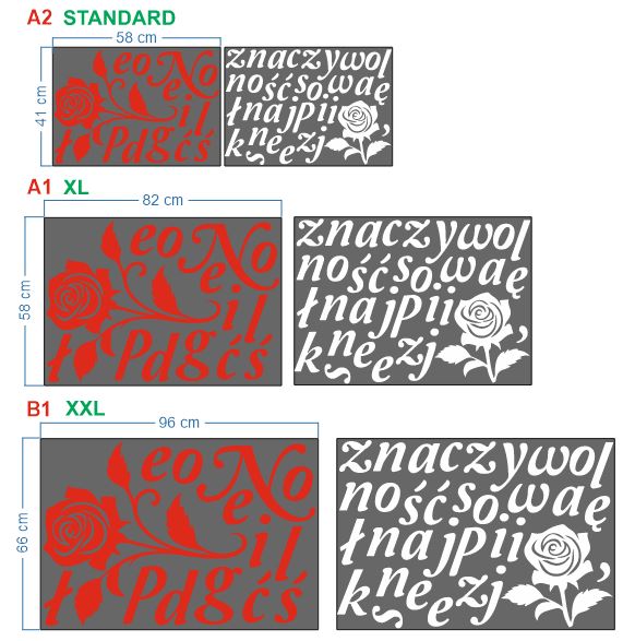 Standard około 160x80cm -litera duża: 11,5 cm; mała: 7cm