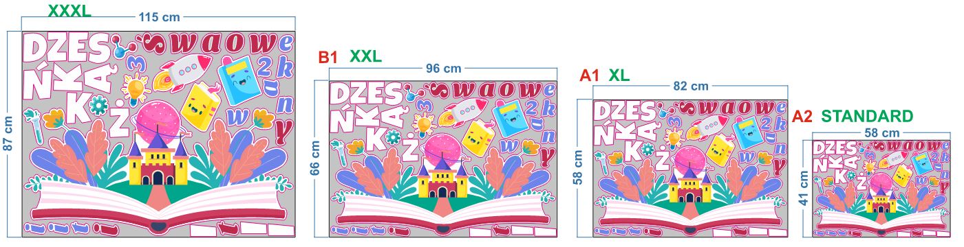 Kolorowy zestaw dekoracji wydrukowany na kartonie o gramaturze 200g, wycięty po kształcie, na życzenie zalaminowany - idealny do uatrakcyjnienia gazetek szkolnych, akademii czy innych uroczystości.