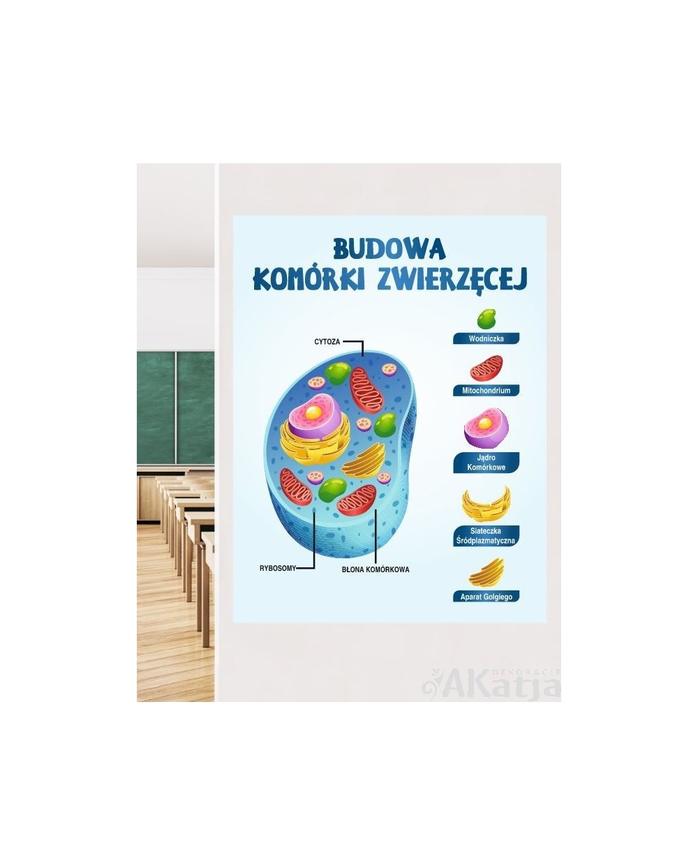Naklejka na ścianę z budową komórki zwierzęcej. Przedstawia jej przekrój z graficznym przedstawieniem każdego elementu oraz jego słowną nazwą.