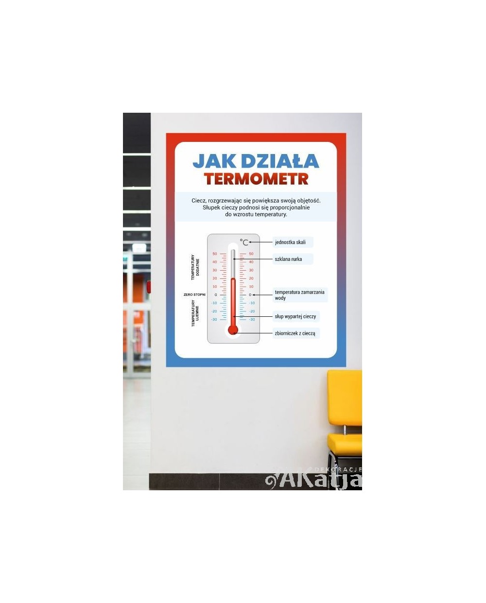 Kolorowa, edukacyjna naklejka ścienna przedstawiająca działanie termometru.