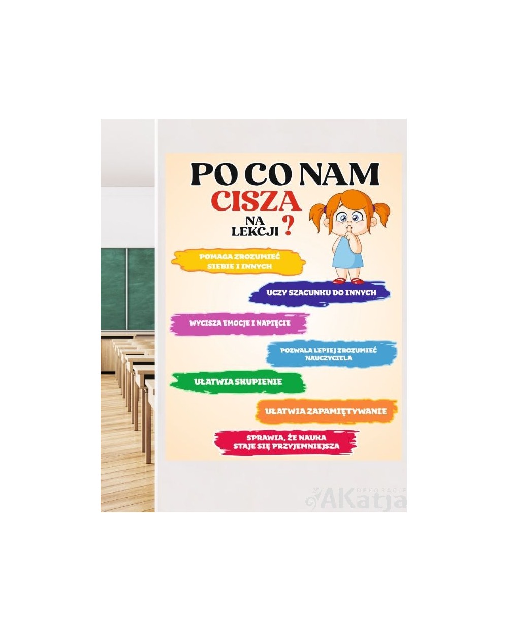 Kolorowa i czytelna naklejka przedstawiająca kilka odpowiedzi na pytanie czemu służy cisza na lekcji to doskonały element dekoracyjny i dydaktyczny do każdej szkoły podstawowej, sali lekcyjnej czy korytarza szkolnego.