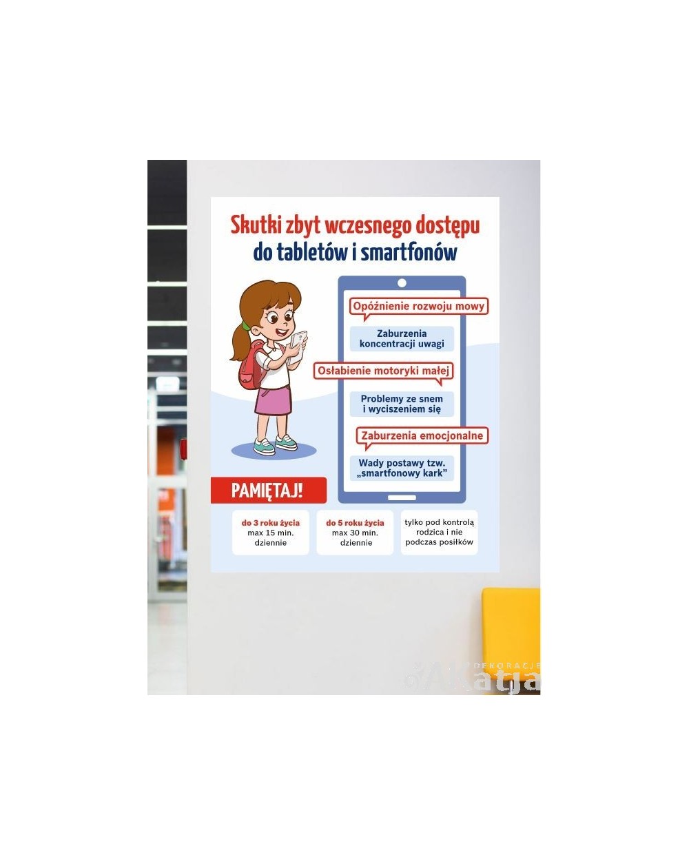 Kolorowa i czytelna naklejka przedstawiająca skutki zbyt wczesnego dostępu dzieci do smartfonów i tabletów.