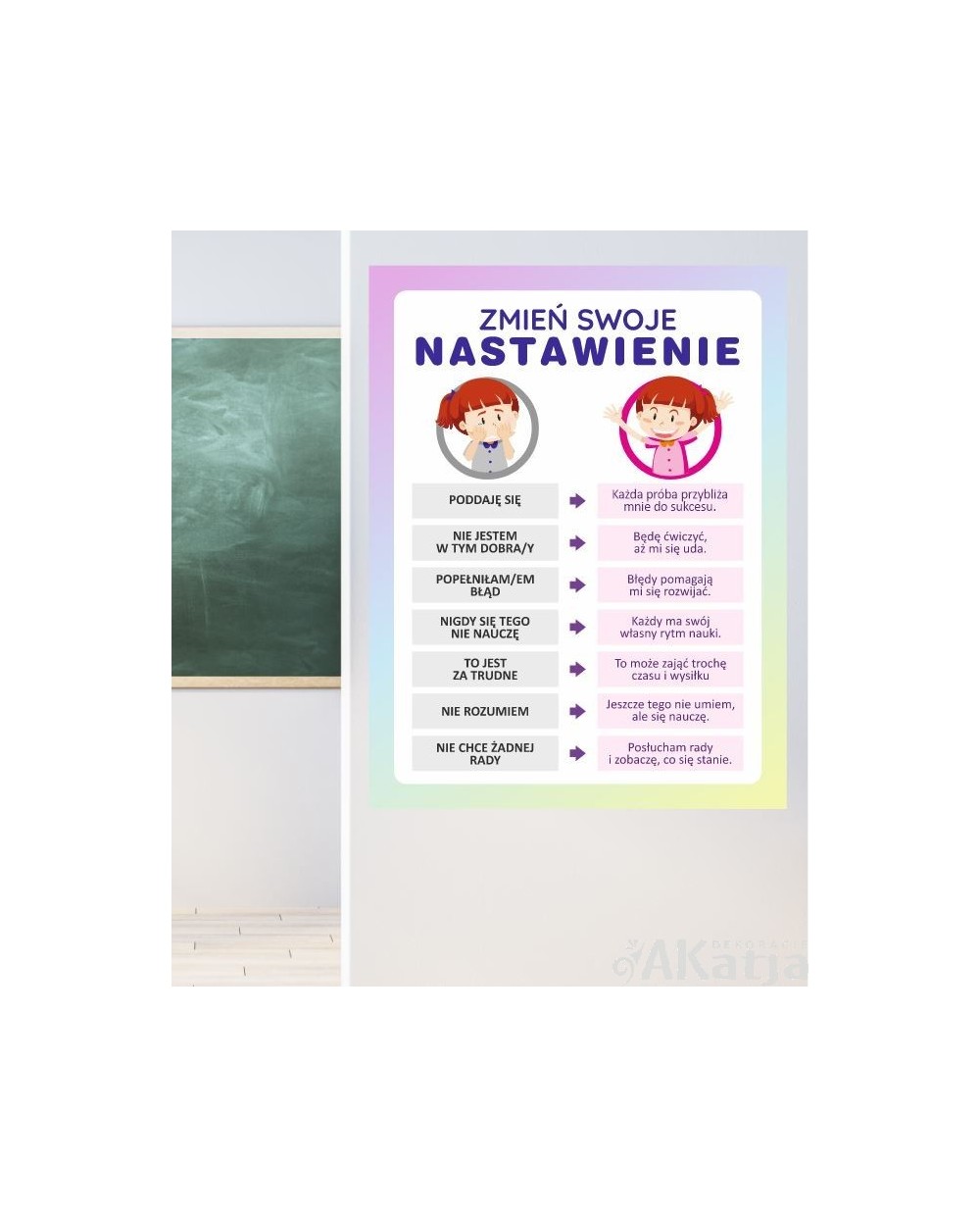 Kolorowa i czytelna naklejka przedstawiająca jak można zmienić swoje nastawienie.