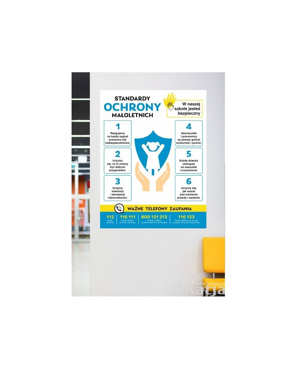 Kolorowa i czytelna naklejka przedstawiająca standardy ochrony małoletnich wraz z numerami telefonów zaufania.