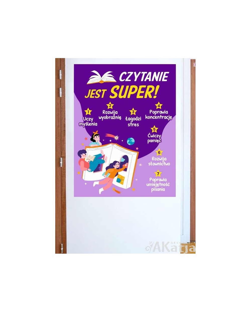 Kolorowa i czytelna naklejka edukacyjna przedstawiająca zalety wynikające z czytania książek.
