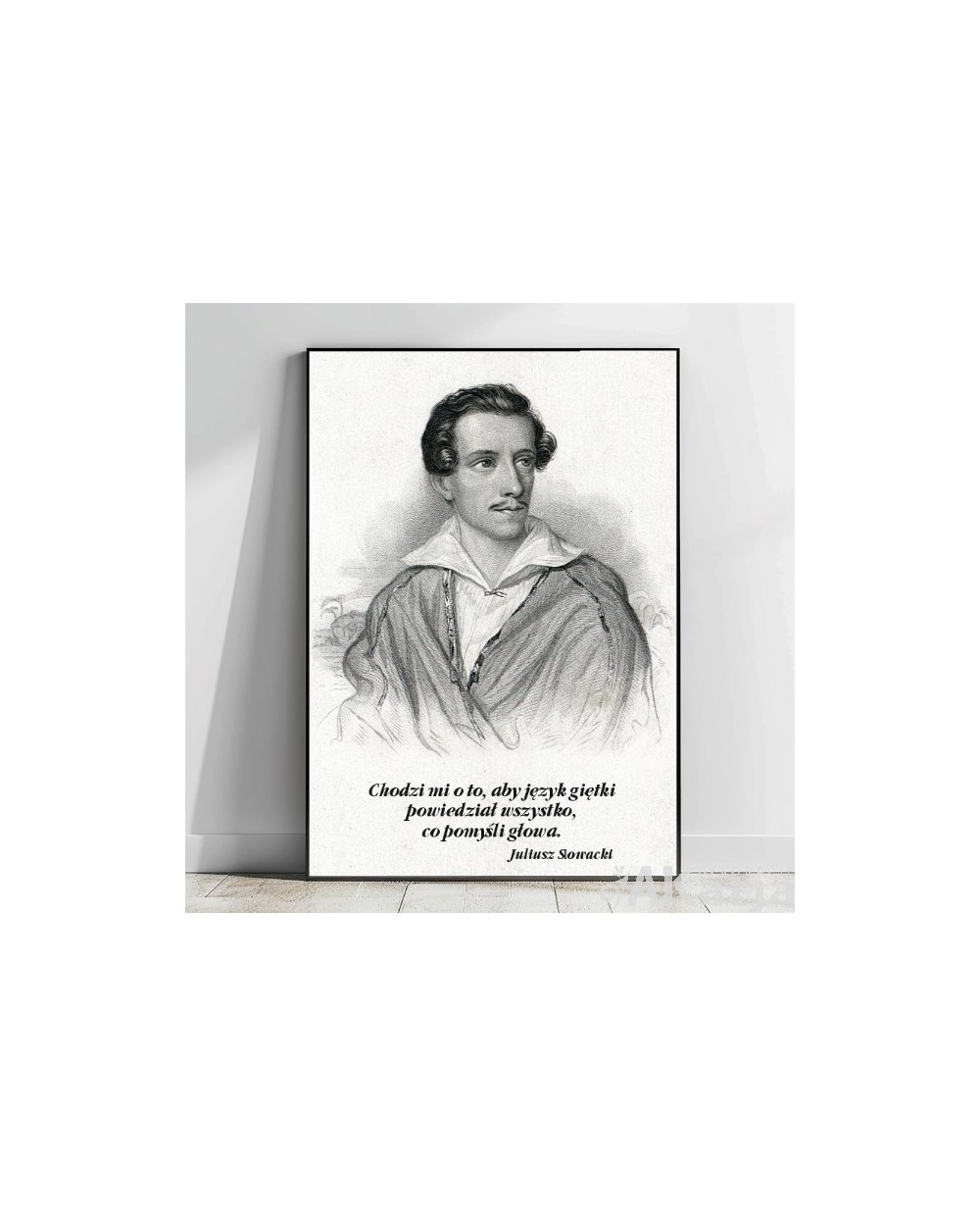 Plakat z napisem: Chodzi mi o to, aby język giętki powiedział wszystko, co pomyśli głowa. Juliusz Słowacki.