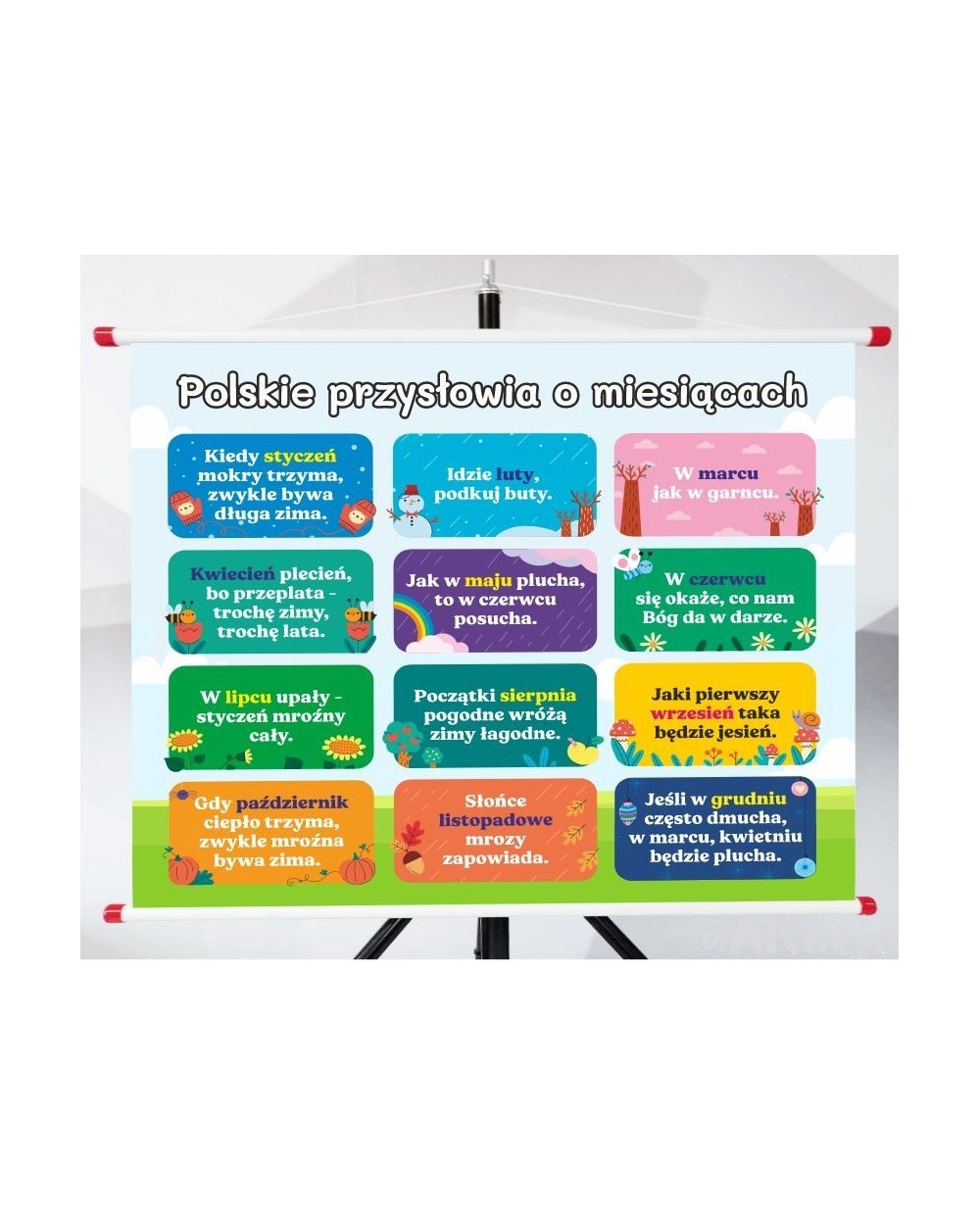Plansza - plakat z treścią edukacyjną wydrukowana na wodoodpornej tkaninie winylowej, oprawiona w rurki z zaślepkami i sznurkiem, które umożliwiają powieszenie planszy na haczyku, gwoździu, pinezce itp. Dzięki dołączonym rzepom planszę można zwinąć i łatwo przenosić, przechowywać.