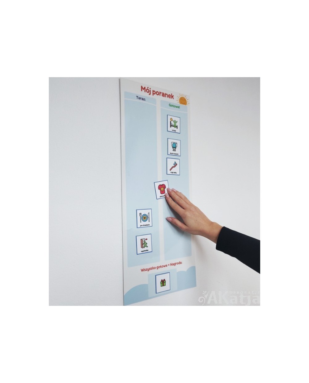 To gotowy zestaw do codziennego używania, który pomaga dziecku przejść przez poranną rutynę krok po kroku.