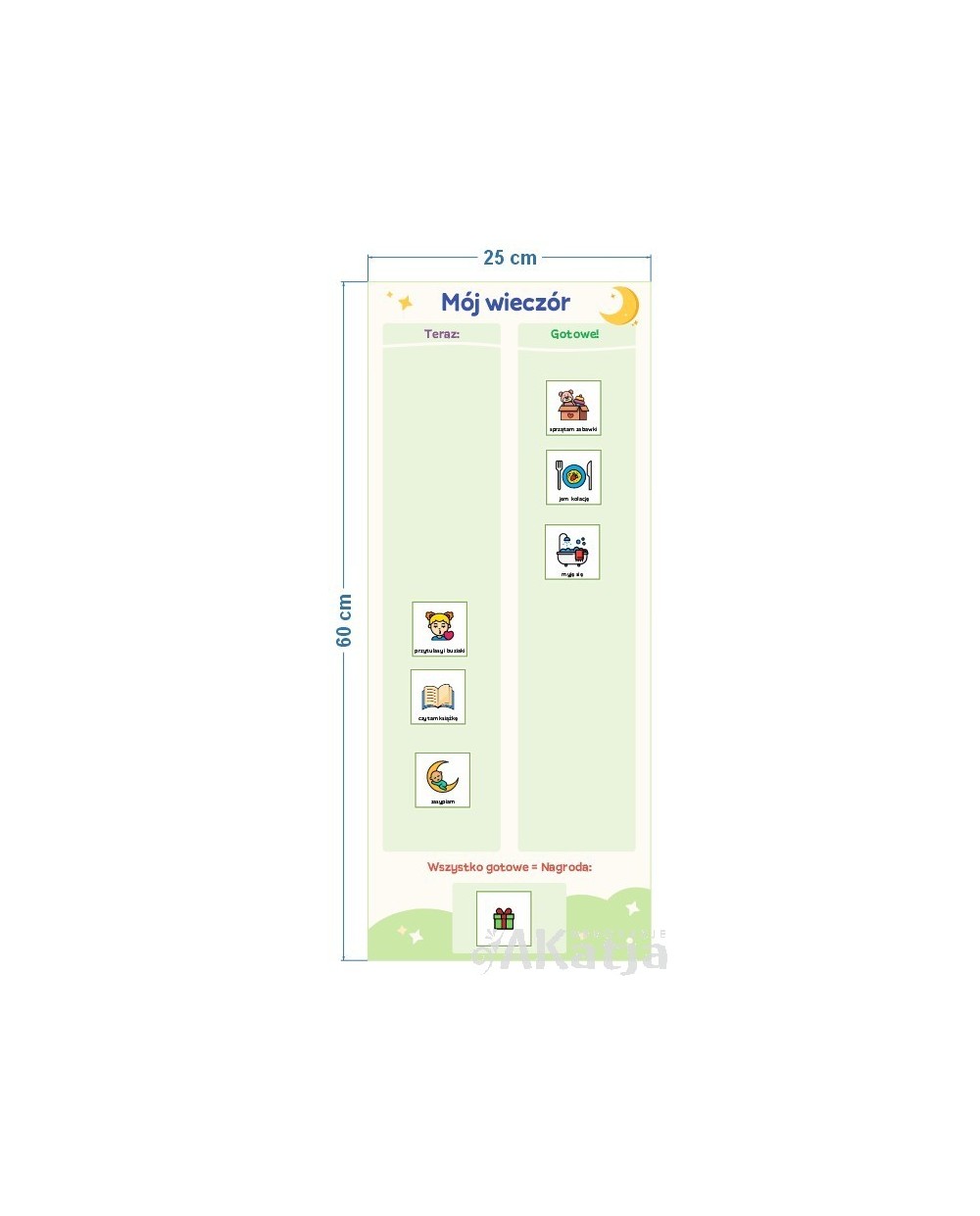 „Mój wieczór” to tablica magnetyczna z zestawem obrazków, która wspiera spokojne zakończenie dnia i przygotowanie do snu.