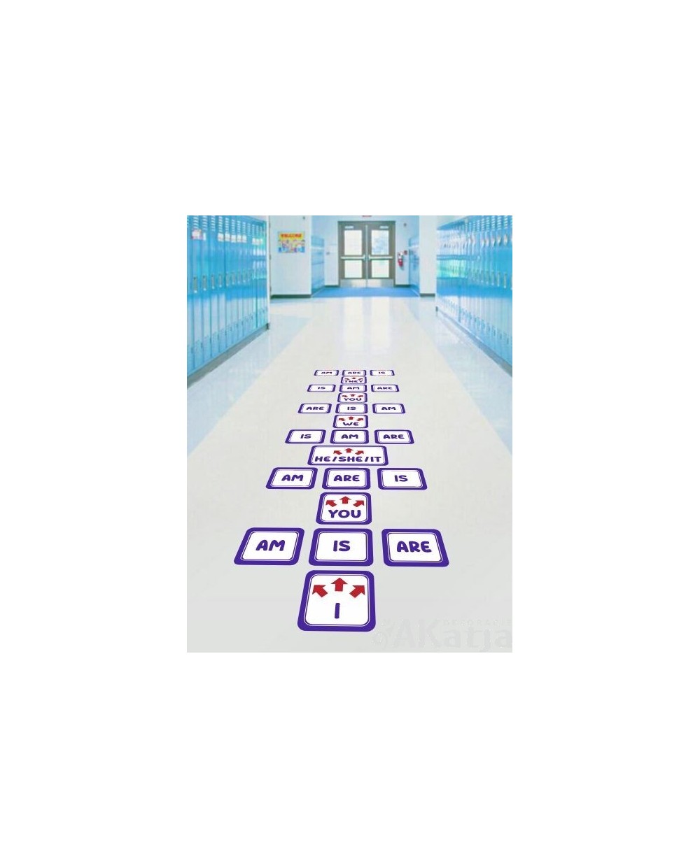 Edukacyjna ścieżka podłogowa z naklejek antypoślizgowych jest wyjątkowym narzędziem wspierającym naukę odmiany czasownika to be w sposób angażujący i ruchowy.