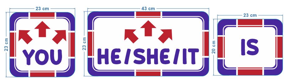Cały zestaw jest zaprojektowany tak, aby tworzyć interaktywną trasę, po której uczeń jest prowadzony krok po kroku, przeskakując z jednego miejsca na drugie. Każdy punkt ścieżki jest oznaczony jedną możliwością odmiany czasownika- uczeń musi wybrać odpowiednią formę.