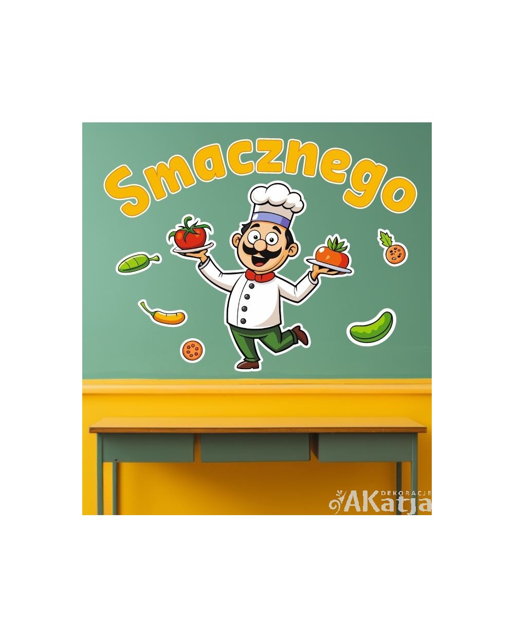 Kolorowa naklejka „Kucharz i napis smacznego” z grafiką kucharza oraz warzyw i owoców to idealna dekoracja ściany lub drzwi w szkolnej lub przedszkolnej jadalni. Zielony, stylizowany napis oraz barwne ilustracje zdrowych produktów – takich jak marchewka, pomidory, szparagi czy bakłażan – od razu kojarzą się z posiłkiem i zdrowym odżywianiem. To nie tylko estetyczna ozdoba, ale również element edukacyjny, który wspiera promowanie zdrowych nawyków żywieniowych wśród dzieci.